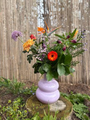 Zoek niet verder! 'Frisse Fleurigheid' is een vrolijk, nonchalant veldboeket vol oranje en paarse bloemen. Deze twee kleuren benadrukken elkaar enorm, wat zorgt voor een frisse en moderne uitstraling.