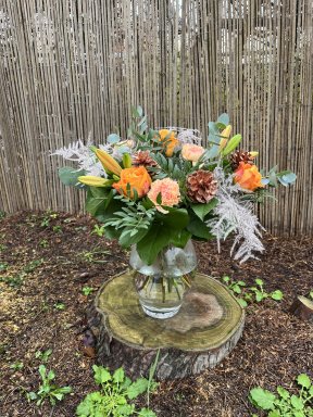 Dit boeket wordt voor u geschikt met Eucalyptus, Pistache, Salal, Asparagus, Lelie, Roos, Anjer en Denneappels.