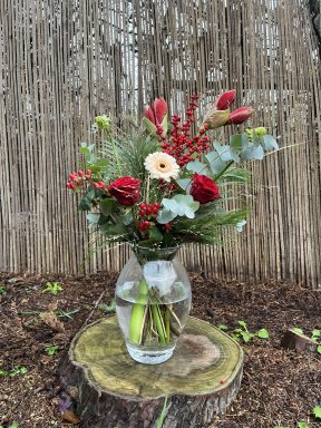 Dit boeket wordt voor u geschikt met Eucalyptus, Phoenix, Pinus, Hypericum, Rozen, Gerbera, Grassen, Ornithogalum, Amarylllis en Ilex.