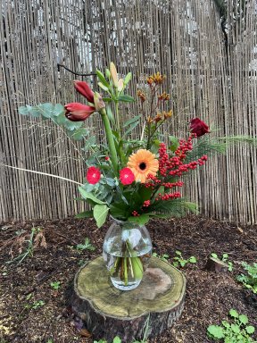 Dit boeket wordt voor u geschikt met Eucalyptus, Pistache, Salal, Amaryllis, Lelie, Trosanjer, Roos, Ilex, Gerbera, Kangeroepoot, pinus en grassen.