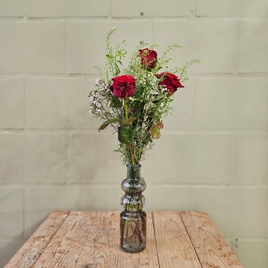 Het boeket wordt geleverd inclusief een hoogwaardig zwart glazen vaasje. Het zwart van het glas zorgt voor een adembenemend contrast met het felle rood van de rozen, waardoor de kleuren bijna van de tafel lijken te spatten. Een modern juweel dat in elk interieur tot zijn recht komt.