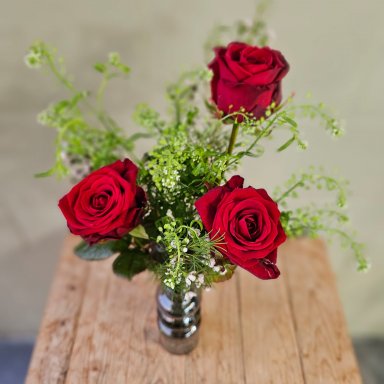 Het hart van dit boeket wordt gevormd door de wereldberoemde Red Naomi rozen. Deze rozen staan bekend om hun dieproode, fluweelzachte bladeren en hun subtiele, romantische geur.