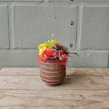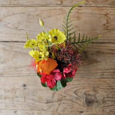 Breng de zon in huis, ongeacht het seizoen. Dit handgemaakt zijden bloemstuk combineert diep robijnrood met levendig oranje voor een krachtig en warm kleuraccent. De hoogwaardige zijden bloemen zijn niet van echt te onderscheiden en geven elke ruimte direct een sfeervolle boost. Perfect voor op de eettafel of als blikvanger in de hal.